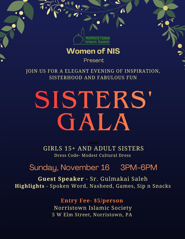 Norristown Islamic SocietyAssalamu Alaikum ladies! 💕 You’re invited to the 2025 NIS Sisters GALA 🗓 Sunday, November 16 | 3–6 PM 🎤 Guest Speaker: Sr. Gulmakai Saleh 💫 Highlights: Spoken Word •…